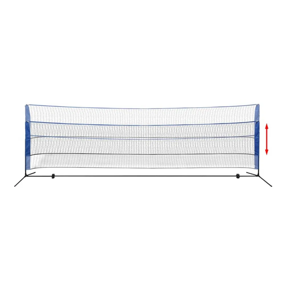 Delivery includes: 1 badminton net and frame set, 3 shuttlecocks, 4 iron ground stakes, 4 plastic ground stakes, 2 PP guy ropes and 1 carrying bag. Colour: White and blue